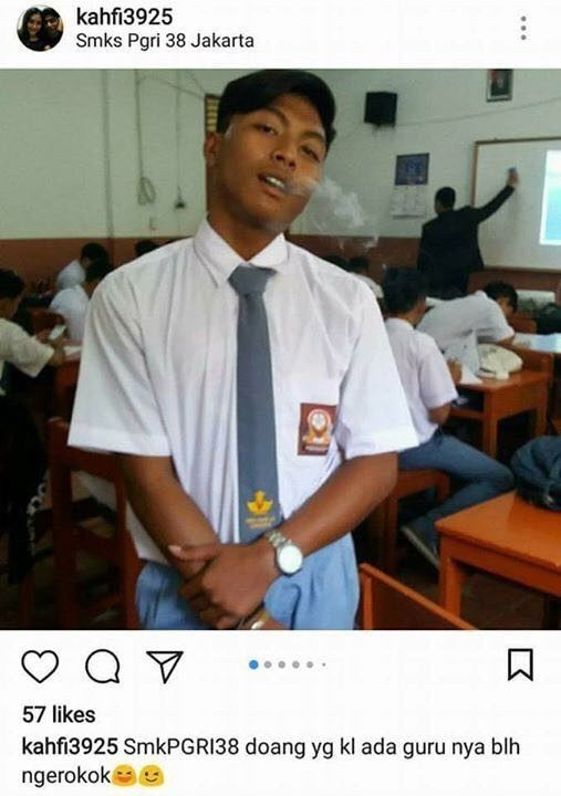 Dengan bangganya, ia pun mengunggah sebuah foto dengan kalimat seperti ini "SMK PGRI doang yang kalau ada gurunya boleh merokok," tulis Kahfi dalam keterangan foto yang diunggahnya.